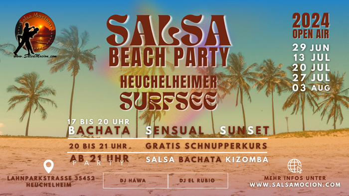 Die Open Air Salsa Beach Partys am Heuchelheimer See haben schon Tradition. Denn bereits im 23. Jahr veranstaltet Salsa Moción die wohl beliebtesten Salsa-Partys des Jahres.